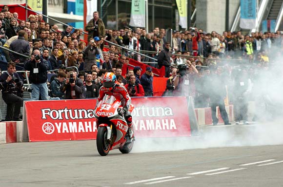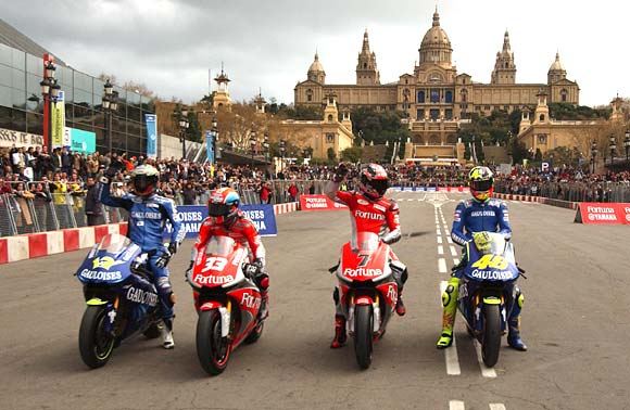 4 versenyző, a Gauloises Fortuna Yamahás Valentino Rossi és Carlos Checa, a Fortuna Gauloises-os Marco Melandri és Norick Abe bőgették motorjaikat Barcelona utcáin. Rossi az átigazolására vonatkozó kérdésre elmondta: "Természetesen ez egy nehéz döntés, nagy változás és egy nagy esély számomra, mérmökeimnek és a Yamahának. Jól tudjuk, hogy ez az év jóval nehezebb lesz számunkra mint a tavalyi, de biztos vagyok benne hogy jó eredményeket fogunk elérni. A helyzet 2003-hoz képest más, hiszen kicsit le vagyunk maradva, és több idő kell hogy a motoron dolgozhassunk, ami azt is jelenti, hogy nincs akkora nyomás azon, hogy minden versenyt megnyerjünk. Mindez persze mégjobban motivál. Örölük annak ahol most tartunk, hiszen mindezt csupán 2 hónap alatt értük el - a Yamahások nagyon keményen dogloztak és ez jó jel a jövőre nézve."
