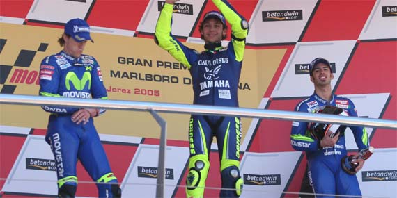 Valentino Rossi egyik legfurcsább, sokak számára megkérdőjelezhető győzelmét aratta Jerezben, a VB nyitófutamán. Míg Sete Gibernau szinte végig hibátlanul motorozott, addig a címvédő Rossi több hibát is vétett a futam során (a reggeli szabadedzésen példának okáért ripityára törte Yamaháját). Bár az utolsó körben átvette a vezetés a helyi menő Gibernau-tól, egy jobbos kanyart elmért és szinte vérre menő csata bontakozott ki kettejük között. Az eredmény: az utolsó kör utolsó kanyarjában Rossi egyszerűen kilökte a spanyolt a sóderba. Sete szemmel láthatóan csalódott volt -ki ne lenne az hazai közönség előtt-, akárcsak a tavalyi esztendőben Ausztráliában, amikor Rossi hasonló körülmények között verte meg. “A motorversenyek néha ilyenek” – mondta Rossi az eset kapcsán. “Tudom hogy Sete nem örül, de hátra van még 16 verseny, és számtalan kemény csatát fogunk még vívni. Ezen a futamon igazán magasan volt a mérce.” – fűzte hozzá a címvédő.