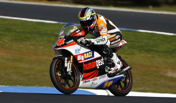 A legkisebbeknél ezúttal sejteni lehetett, hogy Bautista dűlőre viszi a dolgokat, igaz Kallio sem adta fel egykönnyen. A finn vitte a pole pozíciót Bautista és Pesek elől, legjobb Hondásként pedig Lüthi tűnt fel a negyedik rajtkockában másnap. Talma sajnos továbbra is küszködik Hondájával és majdnem egy másodpercnyi hátránnyal a tizenegyedik időt futotta. Tóth Imi a pénteki idején nem tudott javítani, de így is a 21. rajtkockáig jutott. A start annyira jól sikerült, hogy meg kellett ismételni, ugyanis többen estek a célegyenes utáni második kanyarban. Többek között Peseknek sikerült a füvön keresztül kigolyóznia pár embert a pályán haladók közül. Időbe telt amíg megkapták a piros zászlót, ami sajnos minket nagyon rosszul érintett ugyanis Talma épp a negyedik helyen motorozott. A versenytávot is 15 körre rövidítették a tévéközvetítések miatt. Ez Bautistának pont elég volt a győzelemhez, jó 3 másodpercet vert Kallio-ra így igazi bajnokhoz méltóan nyerte meg a világbajnokságot. A finn mögött Pasini ért fel a dobogóra, Lüthi pedig rajthelyéhez illően negyedik lett. Talma kilencedikként ért be Fabrizio Lai mögött. „Ma nagyon gyors volt a motor, szeretném ezt megköszönni a csapatnak ugyanis kitűnő munkát végeztek. Tudtam a többi versenyzővel tartani a tempót de öt körrel a vége előtt le kellett lassítanom mert a hátsó gumim túlságosan elkopott. A motor csúszkált a kanyarokban és nem tudtam annyira húzni a gázt, mint az elején. Gratulálok Alvaro Bautistának, tényleg megérdemli a bajnoki címet.” - nyilatkozta Talma. Tóth Imi cseppet sem volt szerencsés, ugyanis a motorja folyamatosan gyengült, ráadásul a futam vége előtt két körrel a kormánylengés-csillapító hibája miatt ki is kellett állnia. „Rendkívül csalódott vagyok, a pénteki jó kezdés után nem tudtuk szombatra jól beállítani a motort, de ami nagyobb baj, hogy ma is ugyan azokkal a gondokkal küszködtem a versenyen. Nem volt elég gyors a motorom, hogy harcba szálljak a pontszerző helyekért, plusz ehhez jött még a kormánygátló hibája, ami a végén úgy befeszült, hogy nem tudtam rendesen elfordítani a kormányt, és kénytelen voltam kiállni.” - nevezte meg Imi a probla okát. A bajnokságot immár behozhatatlan 79 pontos előnnyel Bautista vezeti a 201 pontos Kallio előtt, míg Pasini 172 pontjával a harmadik. Talma 96 pontjával a nyolcadik és mindössze tizenegy ponttal van lemaradva Lüthitől. Ők ketten a legjobb hondás címért csaphatnak össze az elkövetkezendő három futamon. - torro