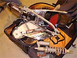 A boxban láthattuk többek között azt is, hogy a versenyzők csak a speckó cuccokat hozzák magukkal bőröndjeikben, mint pl. a telók, segédváz, magát a motort a szponzor gyár adja.