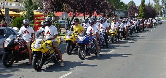 Ezután a találkozó motoros felvonulásba torkollt melyen egy kisebb kört tettünk meg Balatonlellén. Mint holmi lúzer motoros, pár kilóméter után kifogyott a benga a gépünkből, úgyhogy nagy bánatunkra a felvonulás számunkra hamar véget ért. A technikai malőrt viszonylag hamar orvosoltuk, majd visszérve a mólóhoz Mókus és Szabolcs délutáni atrakcióját csodálhattuk meg.