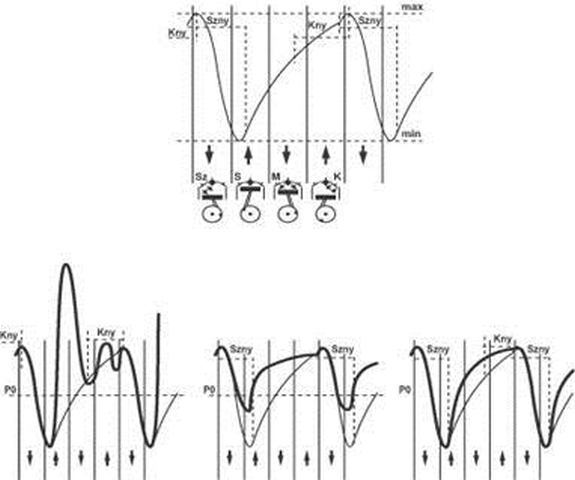 Példaként vizsgáljuk meg a fenti képen látható diagramokat. A felső sorban egy hibátlan motor nyomáslefutását vehetjük szemügyre, míg az alsó ábrák különféle hibákra utalnak. A balszélső, kicsúcsosodó görbe szívószelep hibára utal, szépen látszik, hogy a szívószelep nyitva marad a sűrítésnél és a robbanásnál, ezáltal drasztikus nyomásemelkedés következik be a szívócsőben. A probléma forrása például a szelephézag hiánya vagy egy elégett szívószelep lehet. A második és harmadik rajz fals levegőre, illetve kipufogó-szelep hibára utal, mint látható, a nyomásváltozás eltér az ideálistól. Ezek a diagramok aranyat érnek, hiszen a motor szétszerelése nélkül kaphatunk képet az alkatrészek állapotáról.