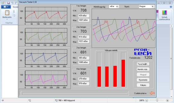 Itt a szívócső nyomáslefutási diagramja látható. Kiválasztható, hogy melyik hengert vizsgáljuk