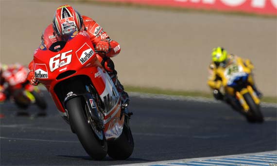 A vasárnapi futam ragyogó időben vehette kezdetét amit Capirossi ki is használt és tökéletes rajtja révén elsőként fordult. Persze Melandri nem hagyta annyiban és már az első körben megelőzte, de a Ducatis azonnal visszavágott és egy rekordkörrel igyekezett leszakítani magáról az üldözőket. Rossi mindeközben Gibernaut tolta hátrébb eggyel. A rámenősen motorozó Stoner ezúttal is túllépett önnön határain és kicsúszott. Rossi tíz körrel a vége előtt megelőzte Melandrit és Capirex után vetette magát, de ahogy a Ducatis megtudta, hogy a hétszeres világbajnok közeledik egyből rákapcsolt. Capirossi végül öt másodpercnyire növelte előnyét és megnyerte a futamot. Melandri előtt Rossi futott be biztos másodikként, Gibernau pedig egy negyedik hellyel szépítette a Ducati hétvégéjét. Capirossi ezzel jókorát faragott hátrányából a többiekkel szemben és optimistán tekint a jövőbe: „Jól rajtoltam de Marco megpróbált megelőzni az első körben. Mondtam magamban, jobb lesz ha nem előz meg mert nem tudtam az ő tempója van-e olyan gyors mint az enyém. Hat vagy hét kör után kezdtem kissé elhúzni, majd a táv felénél a táblámon mutatták, hogy Valentino közeledik. Akkortájt kicsit lassabb voltam, de ahogy láttam Valentino-t jönni újra rá kellett kapcsolnom. A tempóm nagyon jó volt, végig 1’47-es köröket mentem. Ez a győzelem nagyon fontos számunkra, a bajnokság az utolsó versenyig nem dől el. Japánban győzni fantasztikus dolog számunkra és a Bridgestone számára is. Köszönöm a csapatomnak és a szponzorainknak!”