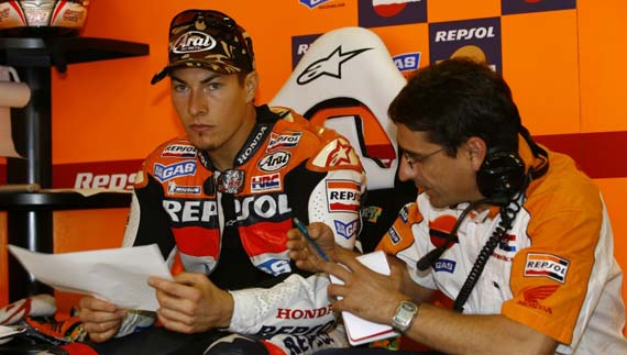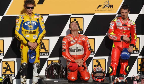 A Rossi-féle sárga zászlós előzés lázában érkezett meg a mezőny Japánba, ugyanis a vitatott versenyszituáció nem maradt annyiban. Suguru Kanazawa, a HRC elnöke ugyanis levelet írt Francesco Zerbinek, a FIM elnökének miközben Paul Butler, a versenybírók főnöke személyesen elnézést kért Nicky Haydentől, amiért hibát követtek el és nem büntették meg Valentino Rossit az emlegetett előzés miatt. Egyelőre semmi konkrét lépésről nem tudni, minden bizonnyal nem fog semmi történni, mivel a szabálykönyv szerint a verseny vége után már nincs lehetőség a korrigálásra. Mindenesetre az illetékesek összeültek Japánban egy tárgyalás erejéig. Ez Rossit valószínűleg teljesen hidegen hagyta, mivel a pénteki időmérőkön ő volt a leggyorsabb. Érdekes volt, hogy a Sepangban történtek elég mély nyomot hagytak a mezőnyben, mivel már pénteken elővette majdnem mindenki a kvalifikációs gumikat és repesztett egy-két gyors kört a biztonság kedvéért. Persze nem ok nélkül mivel egyes híradások szerint a Japánt érintő tájfun széle megcsaphatja a pályát, ami erősen megvariálhatja a rajtfelállást, akárcsak Malajziában. Capirossi csak legyintett és ugyan a versenygumikkal már a kezdetektől fantasztikus köröket ment, de a kvalifikációs gumikat szombatra hagyta. A Ducatisok addig minden erejükkel a versenybeállítások optimalizálására koncentráltak. Az elképzelés tökéletesen bejött, az időjárás kellemes maradt és Capirossi egy brutális 1’45.724-es körrel bebiztosította a pole pozíciót magának. Idén Rossi és az M1 is ütős kombinációt alkottak ezen a pályán, amit kitűnően jelzett, hogy Capirexen kívűl egyedül a Doktor tudott még betörni az 1’46-os határ alá. „Természetesen nagyon örülök annak, hogy sorban a negyedik versenyen az első sorból indulhatok. Az M1-em kezdetektől fogva nagyon jól viselkedett így kipróbálhattunk számos különböző beállítást, amelyeket kombinálva végül megtaláltuk a lehető legjobbat. Most úgy tűnik jól állnak a dolgaink. A motor a kvalifikációs gumikkal is kitűnően ment és a tapadással nincs gondunk. Sajnos egy kvalifikációs gumit elvesztettem mikor Hopkins épp előttem bukott azonban szerencsére a csapatom nagyon jó munkát végzett a boxbeálláskor - gyorsabbak voltak, mint egy Forma1 csapat. Az utolsó gumival végül futottam egy jó kört és így a második helyről indulhatunk.” - nyilatkozta Vale. Az első sorba kvalifikálta magát még Melandri, majd mögéjük került Nakano, Gibernau és Elias. Az időmérőkkel kapcsolatban érdemes még megjegyezni, hogy a Kawasakik ismét kifejezetten dominánsak voltak az edzések alatt. Idén először fordult elő, hogy a De Puniet és Nakano révén két zöld motor állt egy ideig az időtábla legtetején. Sajnos a Team Green ennek ellenére katasztrofális hétvégét zárt ugyanis a versenyt egy motorjuk sem fejezte be, noha Matsudo révén még egy vadkártyás pilótájuk is indult.