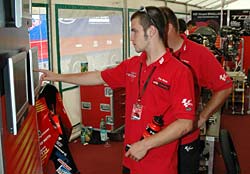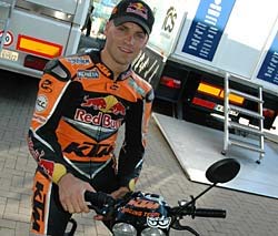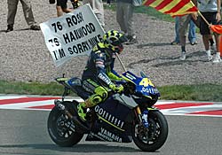 A MotoGP pilótái kezdtek a boxokba szállingózni. A Doktor is célba vette robogójával a kamionját, ráadásul egy hölgy társaságában. Egy-két arcot még elcsíptünk, aztán átmentünk a főhelyre, ahonnan a legjobban lehet a rajtot figyelni. Megabrutál földrengés. Körülbelül így jellemezhető a rajt pillanata, illetve az a pár másodperc, amíg a pilóták elhaladnak mellettünk. A helyi menőt Alex Hoffmant valószínűleg széjjelvágta az ideg, ugyanis az első kanyarban összeakadt csapattársával Olivier Jacque-al, és a hazai szurkolók legnagyobb bánatára feladni kényszerült a futamot. Hayden nagyszerű formáját mutatta, ám Hopkins hatalmas katapultot produkált, és le kell inteni a futamot. A második rajt után aztán Gibernau villogtatta oroszlánkarmait, ám az utolsó körben hibázott, így Rossi 76. győzelmét ünnepelhette.