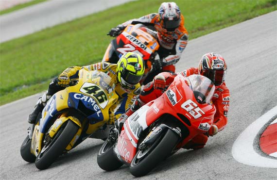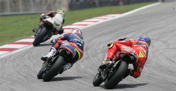 Sepangban tavaly ugye Capirossi győzött de idén óva intett mindenkit attól, hogy ebből levonjon bármit is, mondván: „Minden évad más. Az, hogy tavaly jó voltam itt, semmit nem jelent.” Talán ez így is van, de a Brno-i fantasztikus Capirex-fölény után azért mégiscsak túlzott szerénykedésnek tűnt a dolog. A pénteki szabadedzések is ezt igazolták, ahol az olasz Ducatis elég meggyőzően mindkétszer az élen végzett. A nap vesztese Dani Pedrosa lett, akit keményen átdobott az ezres Honda aminek következtében megsérült a térde. „Ma elég jól mentek a dolgok.” - nyilatkozta később Dani. „Elég jónak éreztem a motort és elégedett voltam a tempómmal. De a 13-as kanyarban buktam és durván értem földet. Az első gumi apró megcsúszásával indult a dolog aztán ledobott a motor és a térdemet beütöttem a szegélykőbe. Eléggé biztos vagyok abban, hogy ez okozta a sérülésemet. Emlékszem az egész balesetre, ami jó, és el is tudtam sétálni noha elég fájdalmas volt. Meglátjuk hogyan érzem magam holnap és akkor majd eldöntjük részt tudok-e venni a délelőtti edzésen - nagyon remélem igen.” Szombaton aztán tényleg ment majd’ húsz kört de a legjobb idejével is csak a mezőny végén végzett. Ha a kvalifikáción is így alakultak volna a dolgai, bajnoki esélyei alaposan megcsappantak volna, mivel Rossi egy bravúros körrekorddal a leggyorsabb volt aznap és Hayden is felküzdötte magát a második helyig.
