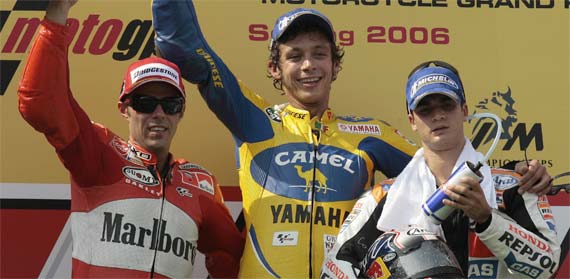 A vasárnapi rajt hibátlanra sikerült, főként a gyakran cefetül startoló Rossinak, aki elsőként fordulhatott. A mögötte érkező Capirexnek mindössze két kör kellett és átvette a vezetést a hétszeres világbajnoktól. A vezető párost Pedrosa egészítette ki trióvá és okozott meglepetést párszor az olaszoknak, míg Hayden, Stoner és később Gibernau lőtávolból figyelte az eseményeket. Ahogy telt az idő Pedrosa a sérülése miatt fokozatosan elfáradt és kezdett leszakadni a vezető kettősről, de a parádé csak ezután kezdődött. Rossi és Capirex fantasztikus küzdelmet mutatott be, kanyarról-kanyarra szinte egymás mellett motoroztak, csúszkáltak és láthatóan mindent bevetettek a végső győzelem reményében. Az utolsó előtti körben aztán Capirex ugrott az élre és majd’ hat tizedet vert Rossira. A Doktor secperc ledolgozta hátrányát és egy szűk balosban betette Yamahája orrát a Ducati mellé, onnan pedig már nem volt visszaút. Ugyan Capirossi még bepróbálkozott a célra forduló kanyarban, amit Rossi is elrontott, de túl nagy sebességgel esett be és kisodródott a szélső ívre. Rossi tehát megérdemelten győzött és újabb értékes pontokat hozott Haydenen, ami igaz Capirex második helyére is. „Ez egy újabb legendás küzdelem volt Loris-szal - nagyon kemény ugyanakkor nagyon fair. Brno-ban el tudott szökni de ma képes voltam rajta maradni. Mindig nagyon látványos mikor mindkettőnk motorja jól működik, mivel bizonyos szekciókban ő a jobb, másutt pedig én, így egy csodálatos harc alakul ki. Nagyon élvezem a vele való versenyzést, mivel nagyon tiszteljük egymást és bízunk a másikban - valószínűleg ő az eddigi legkeményebb ellenfelem, aki egyúttal a legjobb barátaim közé tartozik. A verseny egy bizonyos pontjánál azt hittem el tudok szakadni tőle, de hirtelen újra ott termett és tudtam, hogy ebből csata lesz a végén. Aztán ő akart lelépni tőlem de mentem utána és az utolsó pár körben körülbelül tízszer előztük meg egymást, csodálatos volt.” - nyilatkozta a Doktor később. A harmadik helyen beért sérült Pedrosa örült, hiszen ismét faragott Haydennel szembeni hátrányán. A bajnokság amerikai éllovasa viszont érthető módon nem volt elragadtatva a történtektől: „Úgy éreztem ma minden tőlem telhetőt megtettem és erre büszke vagyok de a versenyzés ezen szintjén ez néha nem elég. Nem akarok kifogásokat keresni - a motor, a beállítások és a gumik elég jók voltak de nem tudtuk kihasználni a bennük rejlő sebességet. Nem valami jó érzés ilyen picivel lemaradni. Persze tovább harcolunk - van még négy verseny és olyan pályák is következnek amiket igazán kedvelek.”