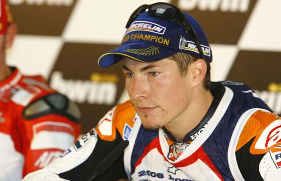 Ami a Rossi-Hayden párharcot illeti, Vale a legjobb pozícióból borzasztó rajtot vett és csak a hetedik volt az első körben. Hayden ellenben jól startolt, negyedikként fordult és a következő körre megelőzte Capirossit is. A kitűnően második helyre katapultáló Pedrosa ígéretéhez híven előreengedte csapattársát, míg Rossi még mindig Stoner mögött küszködött. A negyedik körben aztán Rossi hirtelen kicsúszott egy szűk balkanyarban ezzel pedig eldöntötte a bajnokságot. Hiába állt vissza, a sokszor látott hátulról előre száguldásra most nem került sor. Ami maradt az egy - De Puniet és Stoner lassan borítékolható bukásának is köszönhető - tizenharmadik hely, ami édeskevés volt, mivel Hayden okosan motorozva megelégedett a biztos harmadik hellyel a két Ducatis mögött és megnyerte a világbajnokságot. "Annyira jó érzés mikor valami olyan álmod válik valóra amelynek az életed szentelted. Nagy nap ez a mai nekem, a csapatnak és a családomnak. Szeretném megköszönni mindenkinek otthon, remélem Owensboro-ban most megy a partizás. Amikor Estorilban földre kerültem, úgy éreztem az álomnak vége de nem adtam fel. A versenysportban minden megtörténhet ezért a végsőkig harcolni kell. Azt hiszem a szerencse ahhoz pártol aki tesz is érte és ez a mai nap nagyszerű. Esküszöm a reggeli warmupon ahogy a teltház előtt körözgettem, könnyekkel küszködtem mert tudtam ilyen lehetőség csak egyszer akad az ember életében és ki kell használnom. Egész évben úgy éreztem ez az én szezonom - még Estorilban is, ahol Elias megverte Rossit. Tudtam, nyerek vagy sem, nyugodtan fogok ma este aludni mert mindent beleadtam." - mondta 2006 világbajnoka. Valentino igazi sportemberhez méltóan már a pályán gratulált egykori csapattársának majd a következőt nyilatkozta: "Természetesen nagy csalódás ez számomra mivel az utolsó versenyre nyolc pontnyi előnnyel érkezni és végül mégsem nyertem, ami számomra katasztrófa. Összességében kétszer hibáztam a mai nap folyamán - először a rajtnál majd a bukásnál. Az idei szezon nagyon emlékezetes volt, pár nagy pillanattal, néhány balszerencsével és most pár hibával. De ilyen a versenyzés. Nickynek csak gratulálhatok, mivel egy nagyszerű ember, nagyszerű versenyző és mivel ő volt idén a legjobb, ő a világbajnok. Ismerem őt és a családját is jól, ezért mégha csalódott is vagyok, nagyon örülök nekik."