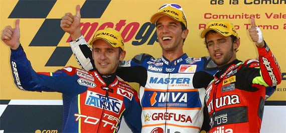 A Team Toth versenyzője egészen a tizenhatodik körig vezetett mikor Aoyama egy pillanatra átvette a vezetés. Tényleg csak egy pillanat volt, mivel szinte azonnal bukott is, amit Loca csak a kavicságyon keresztül tudott kivédeni. A rajtuk loholó De Angelis balról szépen kikerülve őket elhúzott és végre megnyerte élete első 250-es futamát. Loca magabiztosan második lett Barbera előtt, míg Lorenzot negyedikként intették le. Dovizioso a rajtpozíciójának megfelelően hetedik lett és szomorúan nézhette, ahogy Lorenzo bajnoki címét ünnepli. "Az első körben a motor legyengült miközben negyedikbe váltottam, akárcsak Ausztráliában, és csak akkor dolgozott újra 100%-on mire a célegyenes végére értem. Próbáltam felzárkózni az élen motorozó csoporthoz, de a tempóm nem volt elég jó és egyszerűen nem tudtam gyorsabb lenni. Közel mentem Lorenzohoz de nem tudtam egyebet tenni, ő még teljesen nyugodtan kockázatmentesen motorozott. A szezon mindenesetre pozitív volt de nem lehetek teljesen elégedett, mivel már az első versenytől kezdve erőhátrányban voltunk és pár alkalommal több pontot is gyűjthettem volna, hogy Lorenzohoz közelebb legyek az utolsó forduló előtt. Végülis nem sokat változtatott volna a dolgokon, mert itt nagyon nem mentek jól a dolgok. Gratulálok Lorenzonak. Sokat fejlődött és képes volt teljesen kihasználni a motorja adta előnyöket. 2007-re visszatérünk de keményen kell dolgoznunk mert ilyen körülmények között nagyon nehéz lesz megszerezni a bajnoki címet. Szeretném megköszönni a csapatnak az egész szezon folyamán végzett kitűnő munkát!" - zárta szomorúan Dovi az évet. Jövőre állítólag mindketten maradnak ebben a géposztályban, úgyhogy lesz lehetősége revansot venni. Azt hiszem mi magyarok annak örülnénk, ha a gyári támogatású Apriliával Locatelli rendezné le őket.