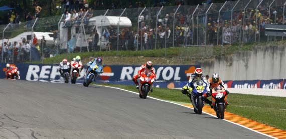 Az időjárás tréfát űzött az időmérőn a versenyzőkből, sokan limitet sem tudtak futni, a hol száraz, hol vizes aszfalton. Az élről a pontverseny éllovasa Casey Stoner indulhatott, míg a második rajtkockára, meglepetésre az előző futam győztese Chris Vermuelen állhatott. Rossinak is úgy ahogy jól ment az időmérőn, mivel még befért az első sorba, ám a rajtot szokásához hűen elszúrta, és visszacsúszott 4-5 pozíciót. Eleinte úgy tűnt, hogy a Ducati hazai pályán verhetetlen lesz, de Capirex és Stoner is fokozatosan pozíciót vesztettek, míg Rossi erőt merítve az olasz közönség bíztatásábó, az élre tört és fokozatosan leszakadt üldözőitől.