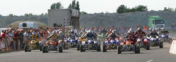 Ismét nagy sikert arattak a Quadok. A 23 fős mezőnyt és annak produkcióját látva a jelenlévő Balkáni Motorsport Szövetség elnöke rögtön lelkesen bejelentette, hogy a következő, Macedóniában, Kicevoban megrendezendő EB fordulón sem maradhatnak el ezek a szörnyetegek. A dübörgő mezőny kissé szétszakadozott ugyan, a lengyel Pawel Sobczyk (Yamaha) elképzelhetetlen tempót diktálva lett első mindkét futamban. Ebben a kategóriában sem tudtunk ismételni, az aradi bajnok, Bucsi Attila saját építésű quadjával (BM 525) a 22. rajthelyről indulva küzdötte fel magát a kilencedik és ötödik – összetettben a hetedik – pozícióba most még jobban azon izgulva, hogy kifogy az üzemanyag, mert az aradi verziónál egy még kisebb tankot sikerült felszerelni a 2,2 km hosszú pálya 9 körére. Vérre menő harcok árán lett második Tóth Demeter (Yamaha), maga mögé utasítva Farkas Tamást (Yamaha). A másik nagy esélyes, az átépített járgánnyal versenyző Kunkli Tivadar (RST 700) összetettben a negyedik helyre jutott, de nem kis munka árán: az RST beindítása problémás dolog, de a rajthelyen mindkét futamban sikerült, ám a második futam elején lefulladt, majd’ fél kör hátránnyal eredt Tivadar a mezőny után, és kimeríthetetlen kitartása révén 11. lett. Egy Quadok esetében ritka látványosságnak is szemtanúi lehettünk Vekedel Gábor bukása láttán. Szerencsére a versenyző nem sérült meg, de gépe inkább gombóc formát vett föl a 4-5 átfordulás után.