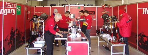 Érdekes volt, ahogyan a MotoGP-s Kawasaki, vagy éppen egy Ducati húz el a 125-ösök mellett. Szóval a színvonal igazi GP szintű. Szerencsére az időjárás is kedvez, bár ma egy erős zápor több órára leállította a tesztet, de elötte és utána is kellemes napsütéses idő volt. A Team Hungary már az új motorokkal tesztel, de teszt lévén nem pazarolnak, így még nem vetnek be minden új alkatrészt (pl. az új idomot sem) és a fogyóeszközökkel is ’spórolnak’. Ez történt ma is. Mivel az időjárás nem volt a legmegfelelőbb és ez a tesztnap csak 50%-osnak mondható, Tóth Iminek nem tettek be új főtengelyt, hanem a legutóbb Valenciában használttal ment. A főtengelyt 7-800km-enként szokták cserélni, de Imiében ma az utolsó, 32. köre után már 1300km volt benne. Ez a mai napra tökéletesen megfelelt, ám holnapra újat tesznek be. Imi fél 6-kor jött le a pályáról, akkor épp 2. volt Lai mögött, a 25.körében mért legjobb idejével 1.54.5-tel. Ez után a többiek még fél órát mentek, így páran bejöttek elé.