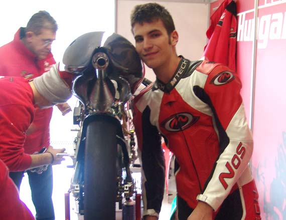 Kellemes napos idő fogadta a mai tesztelőket. Csak 250-es csapattal bővült a mai létszám, így összesen 20 125cc-s pilóta rótta a köröket. Tóth Imi fél 12 körül gurult a pályára és egyből erősen kezdett, máris felugrott az 5.helyre. Aztán rövidesen az első helyen tartotta magát órákon át. Némi gondjuk akadt a motorral, mert egy picit dadogott. A karburálásra gyanakodtak, de 1 órányi sorozatos box-kiállás után kiderült, hogy egy elektronikai hiba okozza az apró befulladásokat. Imi elmondta, hogy 'tulajdonképpen jó volt minden', elégedett az új motorral, főleg, mert még nem is 100%-os, nincs benne minden tuti alkatrész. Elégedett a csapat is, hiszen többször is a legjobb körideje körüli időket futott, és mindezt végig egyedül érte el, nem pedig szélárnyékban bebújva valaki mögé, mint ahogy sokan csinálják. Csináltak egy 'fél' versenyszimulációt is, 12 kört ment egyhuzamban, ez is nagyon jól sikerült, mert a körök közti időkülönbség végig maximum 3 tized maradt. Imi 16:40-kor fejezte be mai edzését, a főszerelő hívta ki, hogy mára elég volt ennyi, a dugóban úgyis már 300km volt. Amikor abbahagyta az állás a következő volt: