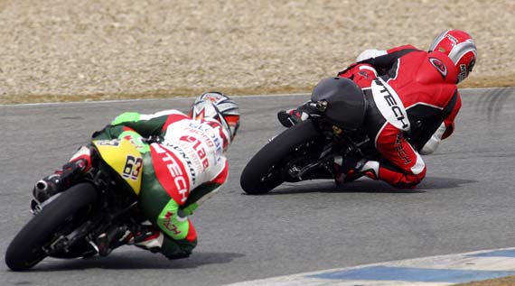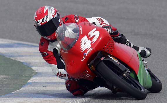 Tóth Imi a harmadikként fejezte be ma 5órakor a Jerez-i tesztet, amikor a 3.helyen állt 1.49.302-vel. Valószínűleg ez az állás már így marad, mert eléggé lehűlt a levegő. Imi teljesen elégedett a csapat mindhárom napi (és egész eddigi) teljesítményével, és a saját magáéval is, bár ahogy elmondta, ma elvileg jobbat kellett volna mennie, mert még szebb idő volt mint tegnap. Azonban tesztelni jöttek, azaz mindent kipróbálni, mindezek ellenére fontos a helyezés is, amire méltán lehetnek büszkék. Délelőtt teszteltek egy újfajta gumit, amivel jó 30kör elment, mert a futóművet próbálták hozzáállítani, de nem sikerült, nem volt jó, így levonva a konzekvenciát rájöttek, erre a pályára nem való ez a gumi. Ez után visszatették a beváltakat, és Imi egyből elkezdett 1.49.-körüli időket menni. Amikor 1.49.302-t ment, kijött kerékcserére és egy kis pihenőre. Visszament, és a ’gumi-járatós’ köre után kezdett volna begyorsulni, de nem várt meglepetésként az egyik kanyart vizesen találta. Beindult ugyanis a pálya mentén egy locsolófej és a szél egyenletesen a pályára fújta a vizet. Jó 15percig áztatta a pályát, amíg ki nem kapcsolták. Imi pár kör után kijött a boxba és várták, hogy felszáradjon a pálya. Az óra viszont már 5-öt mutatott, lehűlt az idő, így a főszerelő végleg kihívta Imit, mert már úgysem tudott volna javítani. Vincent Braillard viszont még a pályán maradt, hiszen őrá még ráfér a gyakorlás, időeredménytől függetlenül. Ő is tesztelte az újfajta gumit, ami nála sem vált be. A mai napra már el is fáradt egy kicsit és zavarta az egyre erősödő szél. Mint elmondta, még jobban meg kell ismerkednie az Apriliával, mert ’nagyon más érzés’.