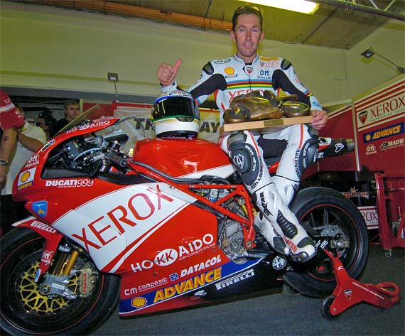 Imolában már nem először dől el a világbajnokság. Ne menjünk messzebb, Corser tavalyi győzelme is az olasz pályán vált kétségtelenné. Bayliss fölényes, cirka 87 pontos előnnyel érkezett Imolába és már csak négy futam volt hátra. Ráadásul mióta superbike versenyt rendeznek ezen a pályán, a Ducati kilenc versenyből ötöt nyert és összességében tizenhat dobogós hellyel büszkélkedhet. Szóval tervezni sem lehetett volna precízebben. Bayliss az elvárásoknak megfelelően látott munkához és ugyan az időmérőkön nem remekelt de a döntő Superpole köre brilliánsra sikerült. 1’48.804-es ideje új pályacsúcs és ezzel megoldhatatlan feladat elé állította üldözőit. Még a második leggyorsabb Toseland is majd’ hat tizedet kapott az ausztráltól! „Sikerült egy jó Superpole-t összehoznunk de Imola nagyon nehéz pálya. Kifejezetten technikás és a felülete is különös szóval keményen dolgoztunk a motoron azért, hogy azt tegye amit szeretnék Őszintén szólva az edzés végére jöttünk rá mi is az amit keresünk. Pontosan az edzés végén, ahogy rátaláltunk egyből jól éreztem magam a motoron. Tudtam, hogy jó kört fogok menni, de nem voltam biztos az 1’48-ban. Most eléggé bízok magamban és jópár kört megtettem a versenygumikkal is. Az a helyzet, hogy a bajnokságban jelenleg jól állok és örülök a pole-nak is. Várunk és meglátjuk hogy alakulnak a dolgok holnap de az biztos, hogy érdekes lesz.” - nyilatkozta Bayliss. Az első sorba került még Pitt és Corser míg a mögülük indulhatott másnap Kagayama, Neukirchner, Haga és Barros.